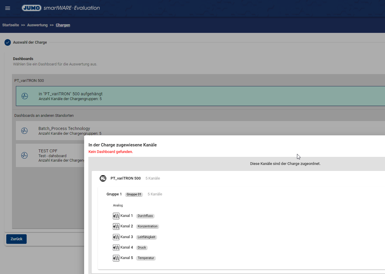 After selecting the batch, the user can compare the signals of the batch with the signals of the dashboard to check whether all relevant data from the batch is also included in its dashboard.