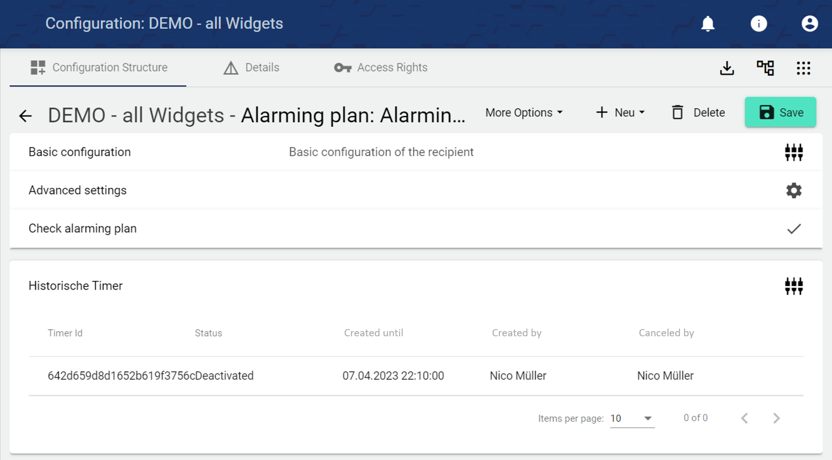3.b) In addition to the widgets already mentioned in 3.a), there are corresponding additions in the configuration of the Alarming Plan. From now on it can be recognized if all settings, e.g. in the linked recipient group, have been made correctly. As in the widget, the alarming plan can be checked by date during configuration. If the alarm schedule was deactivated or activated via "Widget: Alarming plan timer", this can be viewed in the "Historical timer" tab.