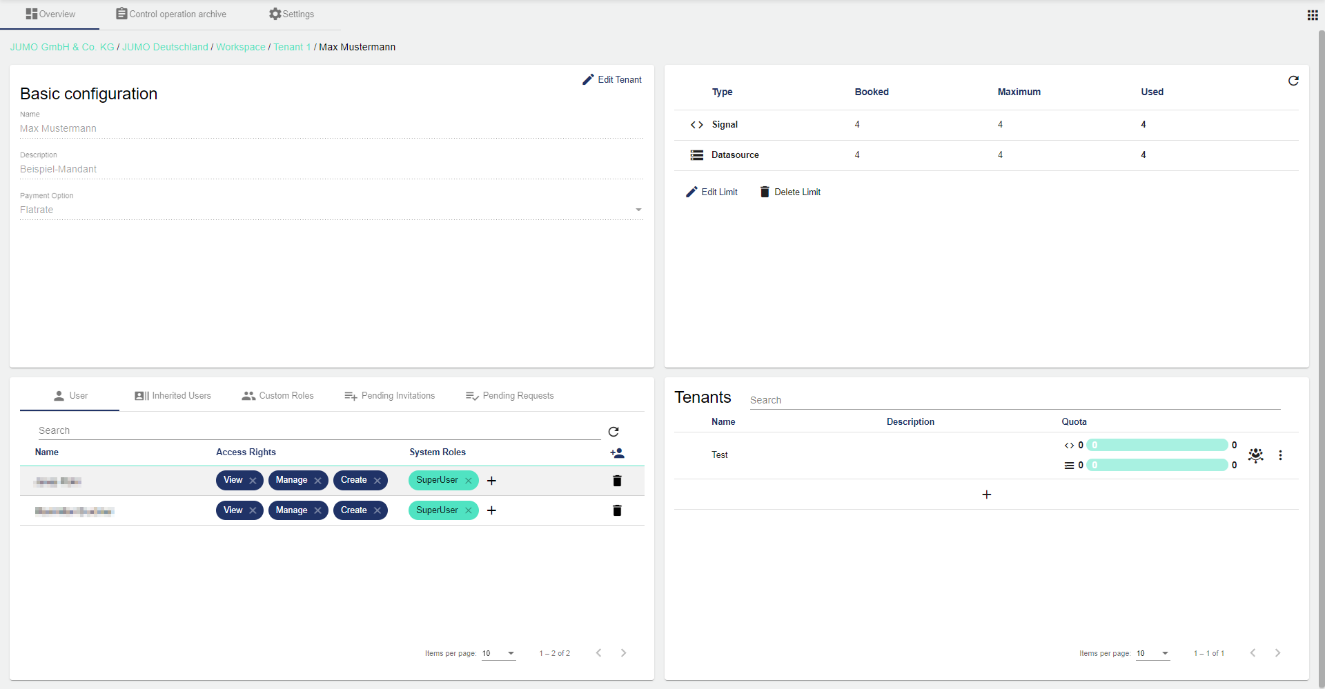 The Administration of a Tenant includes general Settings / information, a Control Operation Archive, an Overview about the number of Signals and Data Sources used, and User Management including the Roles and Rights and all Sub-clients.
