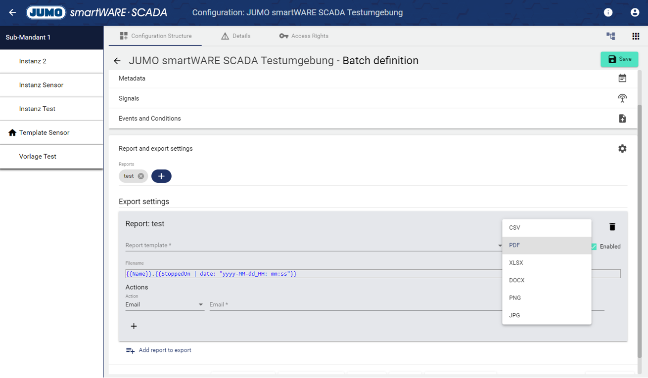 By adding one or more reports, the batch can be viewed in a customized design depending on the Report. In addition, it is possible to send batch reports automatically event-based in different formats by mail or to save them in a directory.