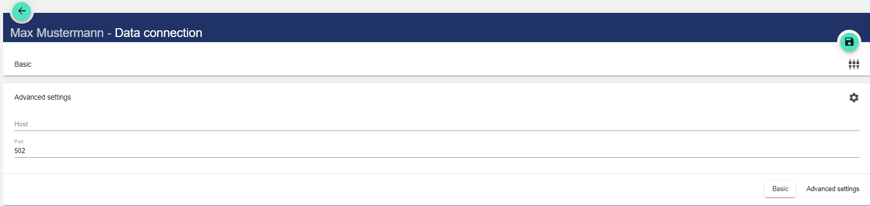 Save via the disk icon in the upper right corner. When using a new data connection, default values are automatically entered.