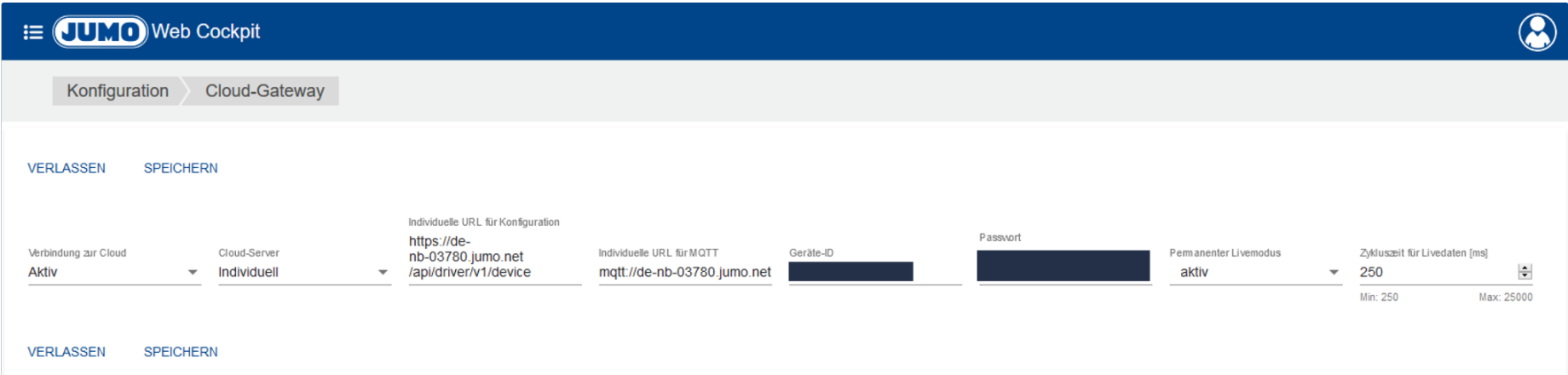 Under Configuration and Cloud Gateway in the "JUMO Web Cockpit" of the variTRON device, enter the device ID and password from the JUMO smart/WARE SCADA.