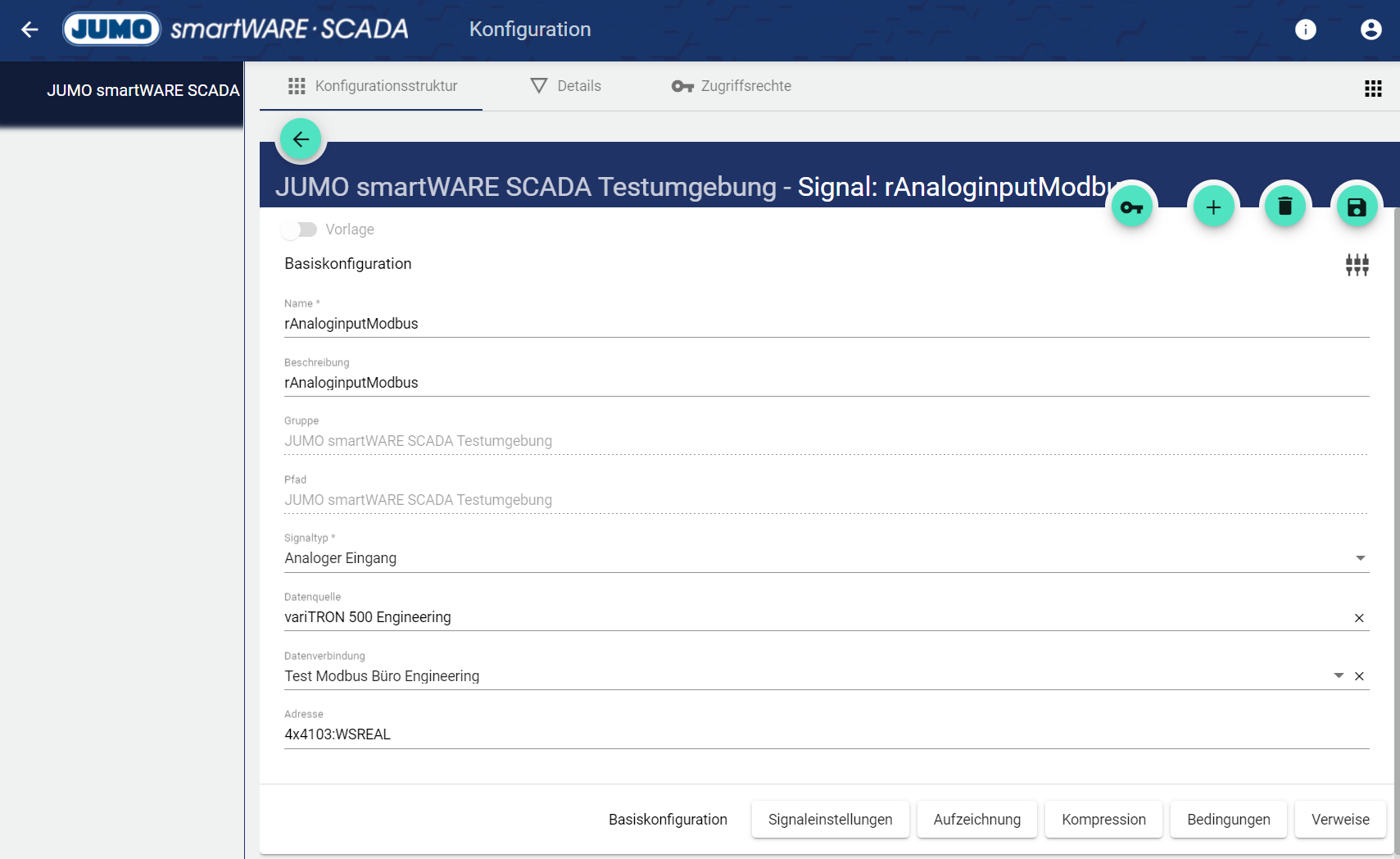 Modbus TCP (With this data connection, it is very easy and possible to retrieve signals from a device (e.g. Aquis Touch, etc.) and forward them to the Cloud without JUMO Setup / Codesys). To select this data connection, please refer to the chapter data connection). (A Modbus Master is integrated in the Cloud Gateway of the variTRON device). How signals are subsequently created is described in the chapter Signal.
