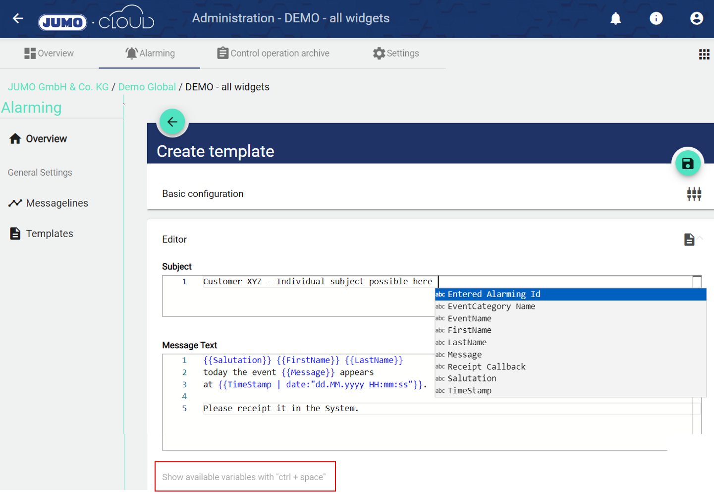 The editor function can be used to enter text that is to be sent. In addition, there are placeholders for variables, which are then used when the alarm is triggered. With the combination CTRL + space bar you get a selection of placeholders, which are filled with the corresponding value on notification.