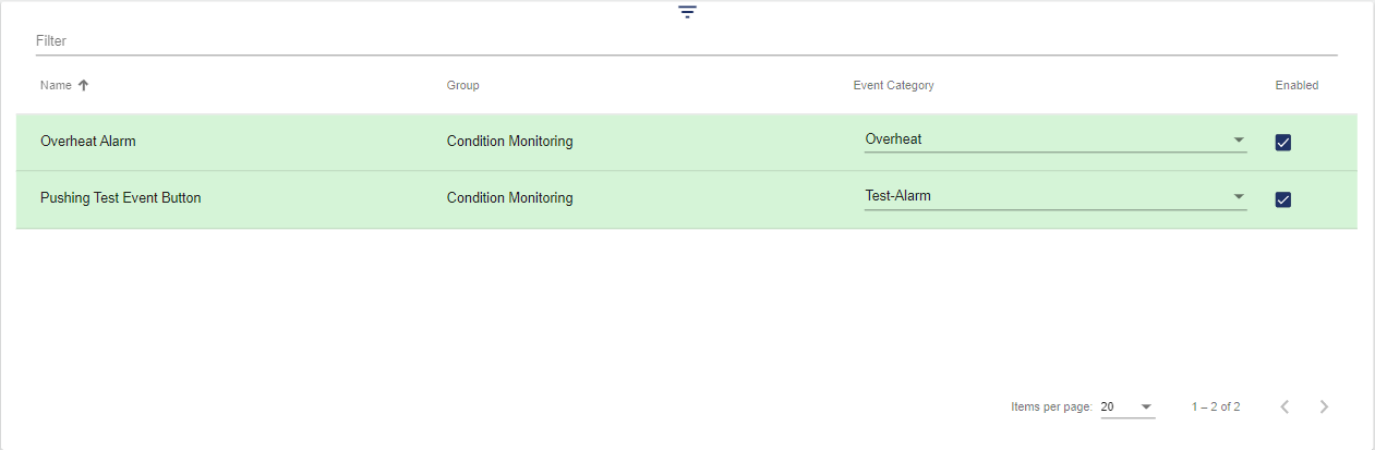 The widget displays Event Definition and allows you to enable or disable them from the Dashboard, and also change their Event Category.