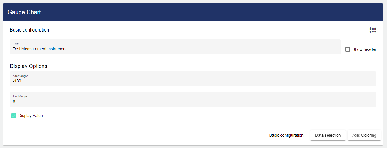 Select the Measuring Instrument widget from the Signals category. In the Basic Configuration of the Measuring Instrument, assign a suitable label (title). The header can be displayed by selecting the check box. You can specify a start or end angle under the "Display options". If the "Display Value" field is activated, the value is also displayed as a number.