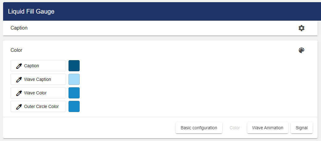 The widget displays the data of the selected analog signal as a wave. Depending on the value and the set limits, the filling level of the circle changes. When configuring the Level Measuring Instrument, there are many options and a preview to visualize the changes in real time. The slider also allows you to manually change the height of the measuring instrument in the preview.
