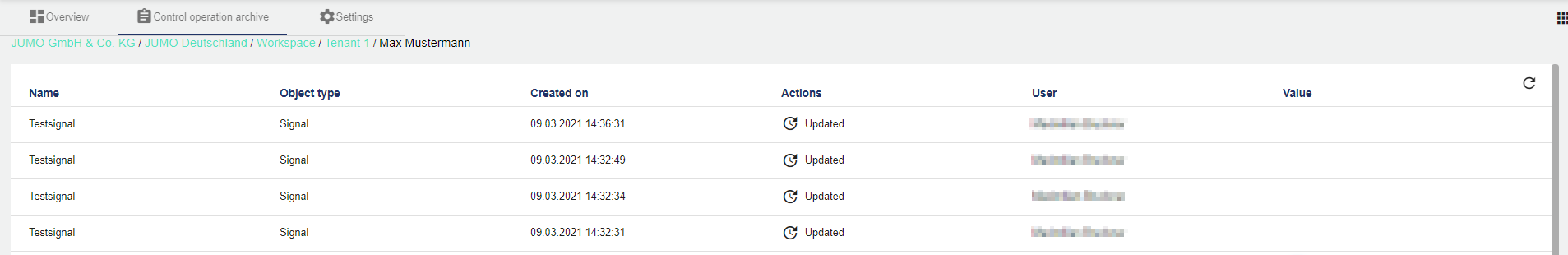 Changes in the configuration and in the dashboard are recorded (also control command in the dashboard).