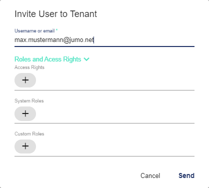 To invite a user or to add a tenant, click the "+" button (see above), the pop-up window below then opens. Suitable rights can be assigned to the user at the same time as the invitation. To do this, simply open the "Roles and Access Rights" area and click the "+". The invitation can then be sent. The invited user then receives a message via the user feed with a request to accept.