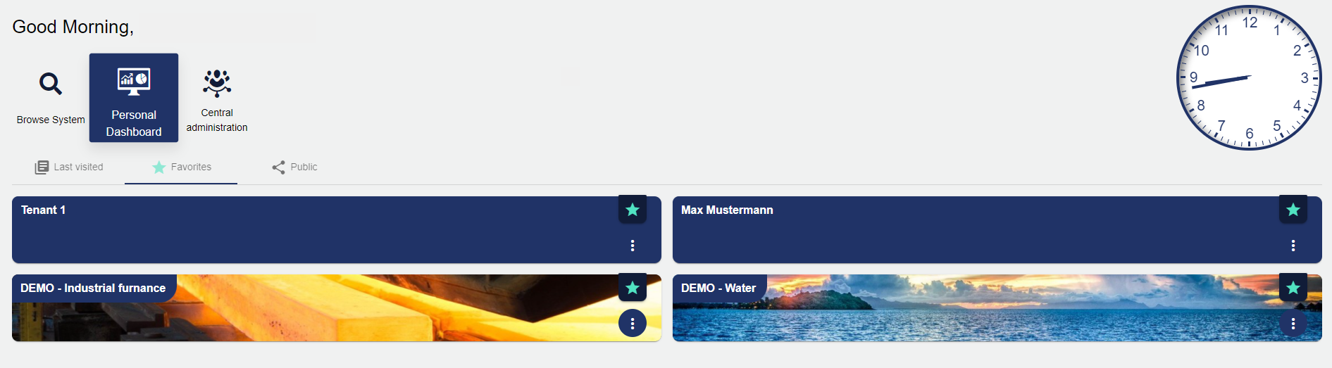 The "Personal Dashboard" is a normal Dashboard that only the logged-in user can view and manage. It is designed to provide a quick overview of all relevant information from various Tenants, Systems and other Dashboards.