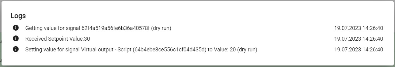 The log can be viewed via the plus symbol on the right. Here actions of the script are listed and calculated or queried or set values can be viewed.