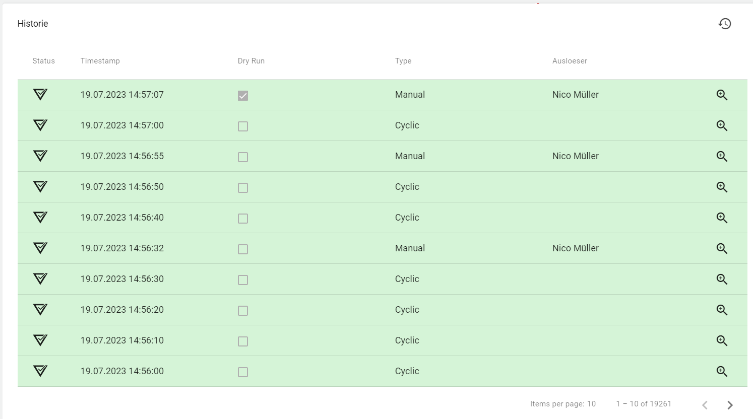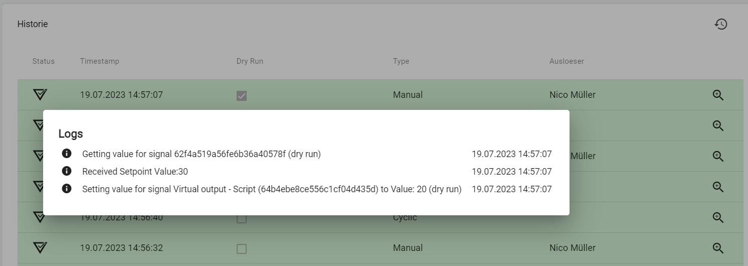 Each triggering of the script is stored in the history. A manual trigger via the "Test" or "Execute" button is recorded as a manual entry. A "Test" creates a "Dry Run" in which no actual script actions are executed.