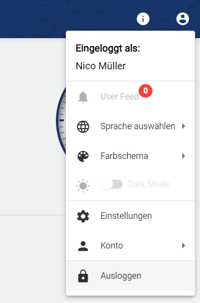 The Dark Mode can be selected via the User Profile icon. This changes the white background to a gray background area.