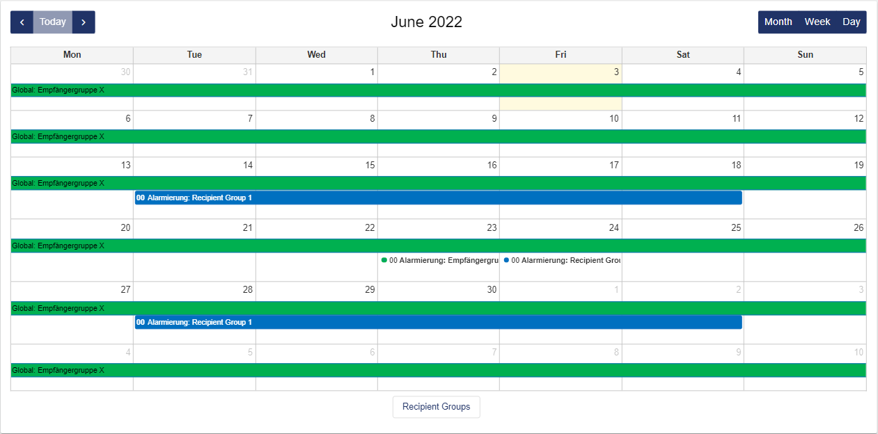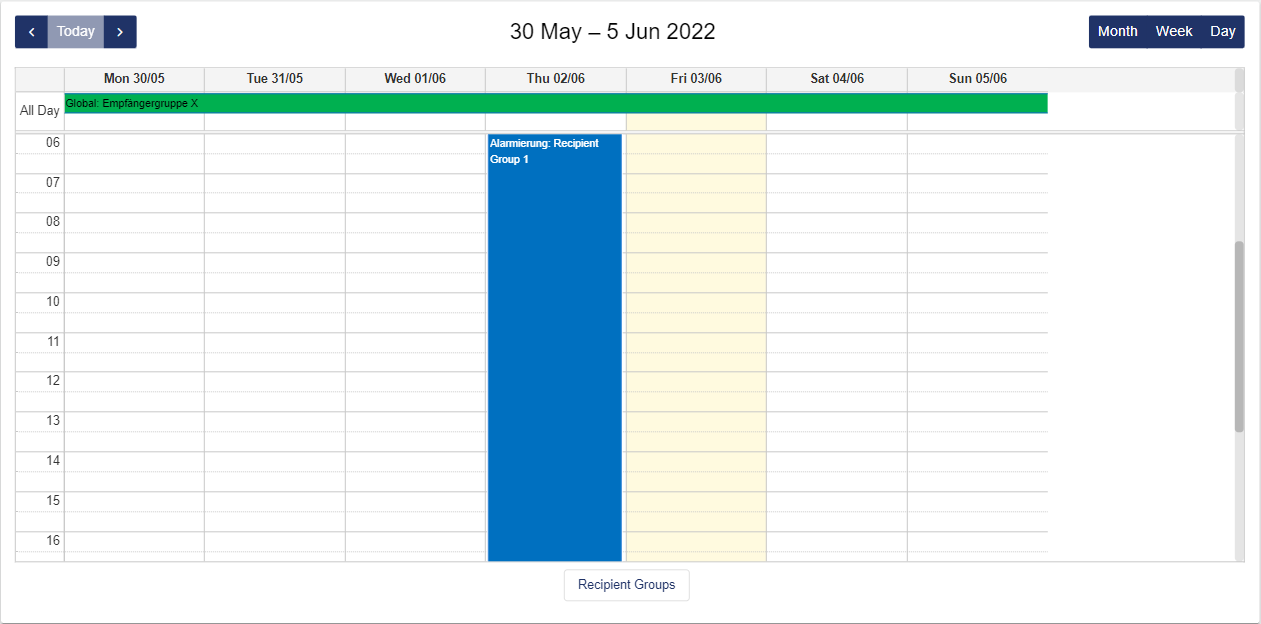 With Alarm Scheduling, you can assign an Alarm Schedule previously created in the configuration to a specific Recipient Group for specific time periods. The calendar view can be displayed in the widget as month, week or day. Here you can view past schedules and plan future ones. A selected Recipient Group can be regularly alerted to specific events using alarm scheduling. As soon as the Event occurs, the group is alerted. By default, the "Global Recipient Group" is selected. The " Global Recipient Group" is continuously alerted should the event occur.