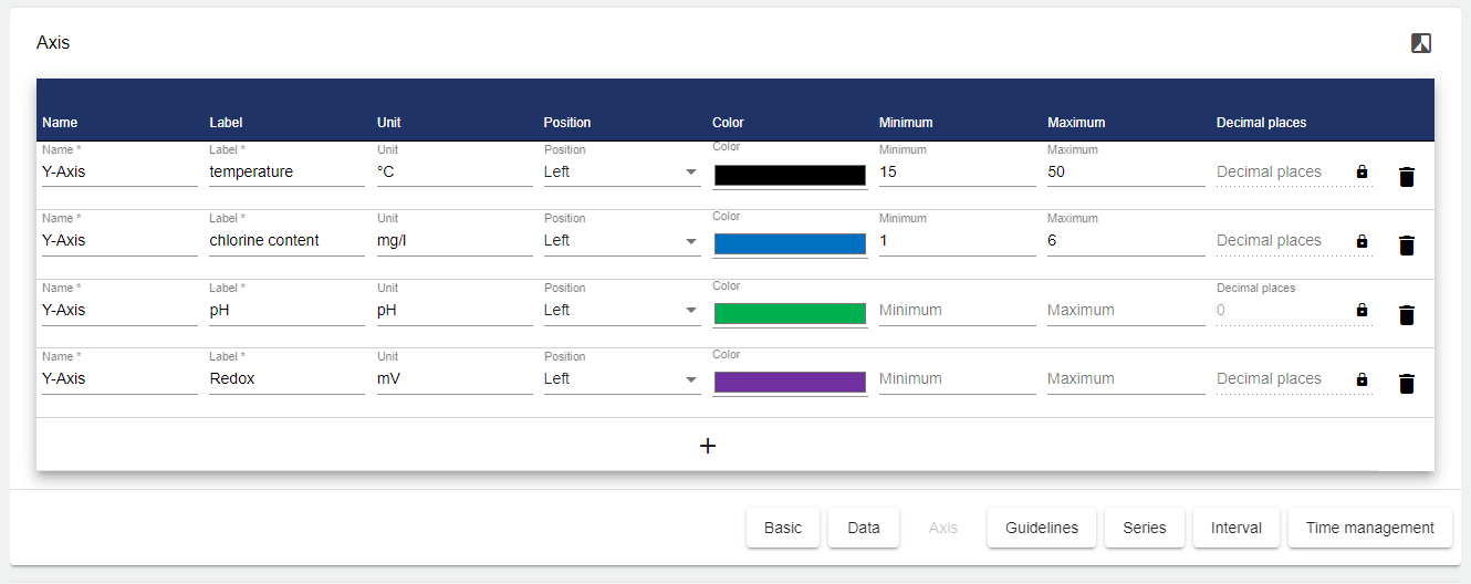 A series is automatically created for all selected data points. A suitable axis must be assigned for each signal. You can also specify the label, line type and color, as well as the line thickness and the decimal places in the chart.