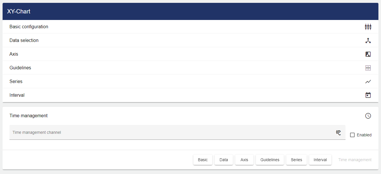 In the "Time Management" tab, you can specify different labels under "Channel" and use them to link multiple analysis widgets. This function is used, for example, if a viewer wants to see signal values at 9 am in all widgets of the Dashboard tab at the same time.