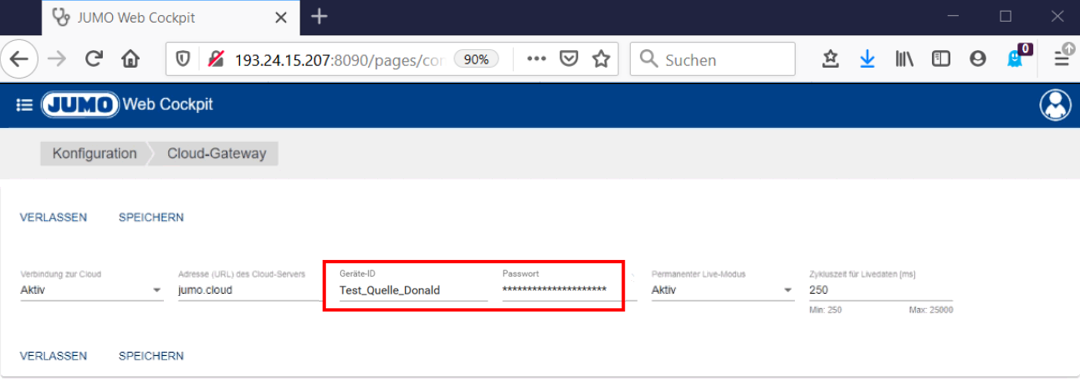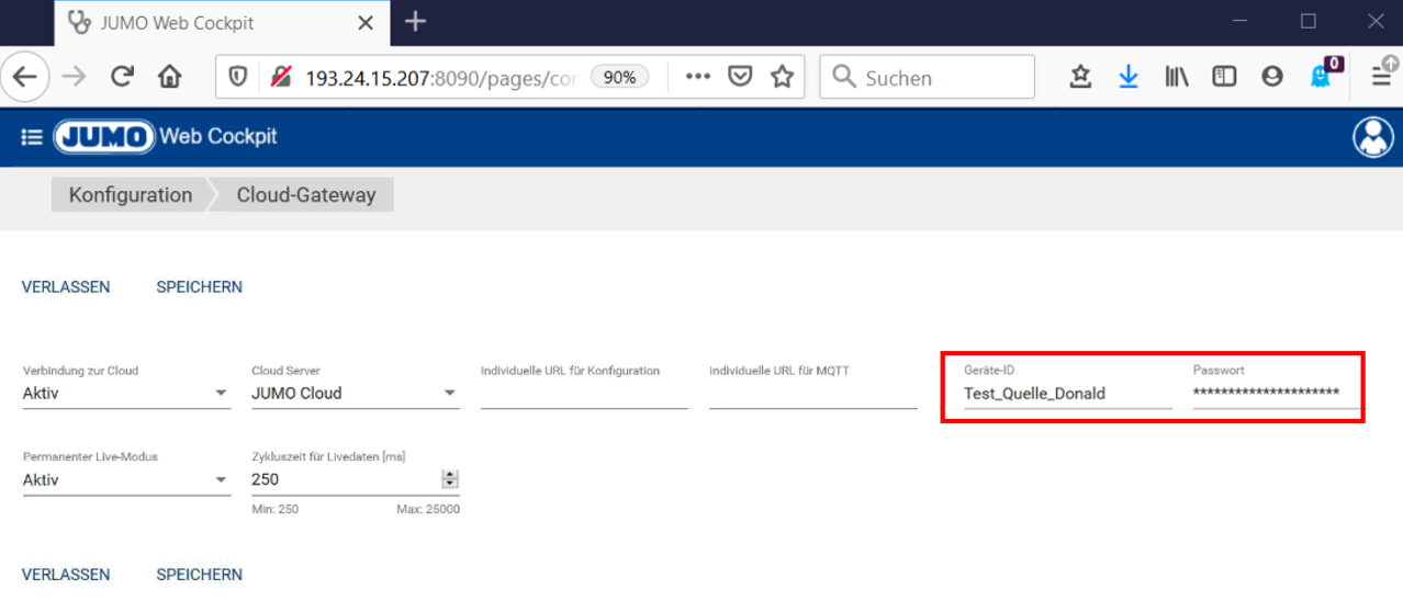 Under Configuration and Cloud Gateway in the "JUMO Web Cockpit" of the variTRON device, enter the following things: