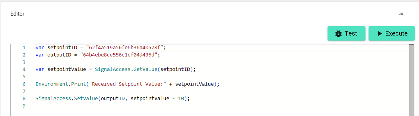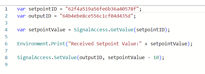 The SignalAccess.SetValue({SignalID}, {Value}): void function can be used to set the value of a signal (output), i.e. the value specified in the second parameter {Value} is sent to the gateway or in case of a virtual signal (signal without data source and data connection) is generated as live value. The signal is specified via the first parameter {SignalID}.