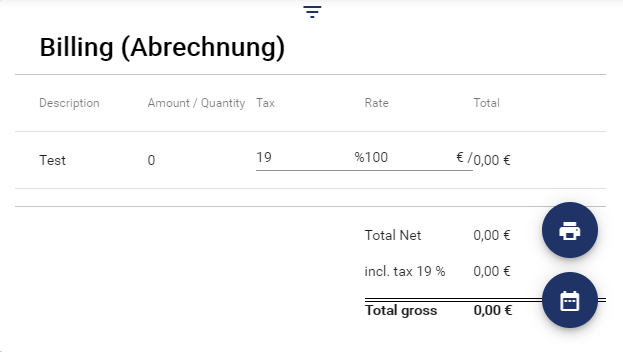 The Billing widget can be used to create a billing statement. A Counter Signal is required for this. A value per unit and a tax rate can also be entered manually. The counter acts as the quantity here.