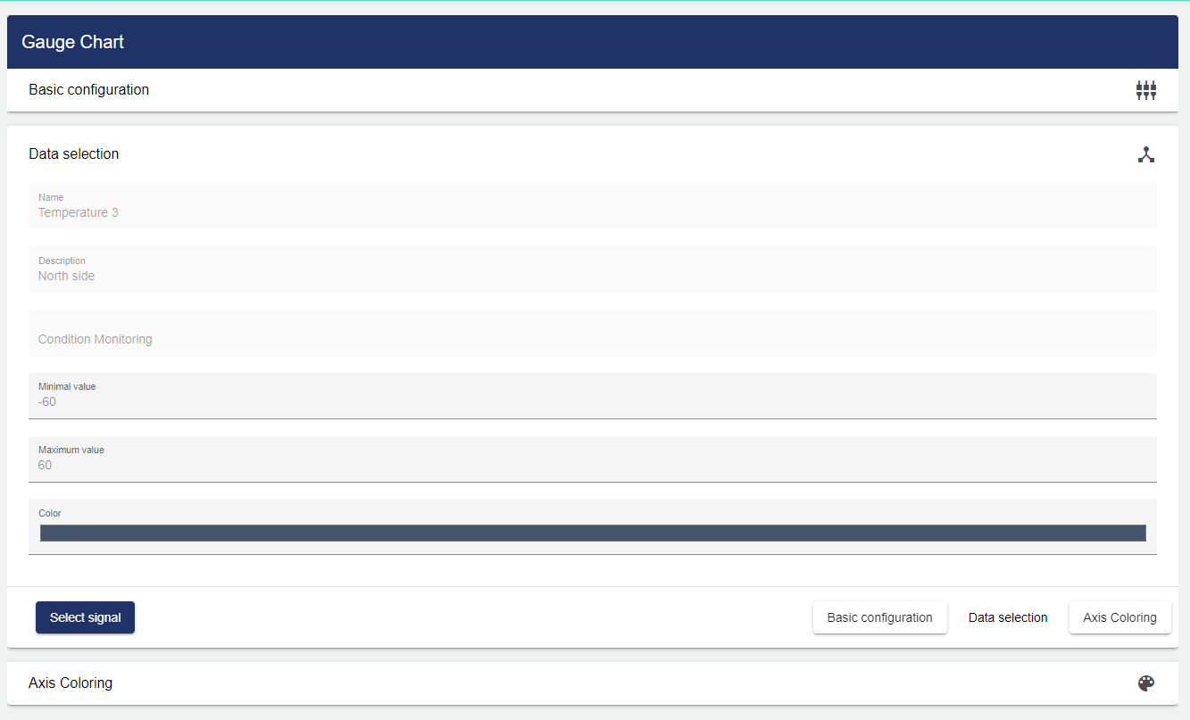 Under the "Axis coloring" tab, certain areas of the axis can be colored differently. The "From" and "To" fields are used to limit the range to be colored. The "Color" field allows you to select and choose the appropriate color.