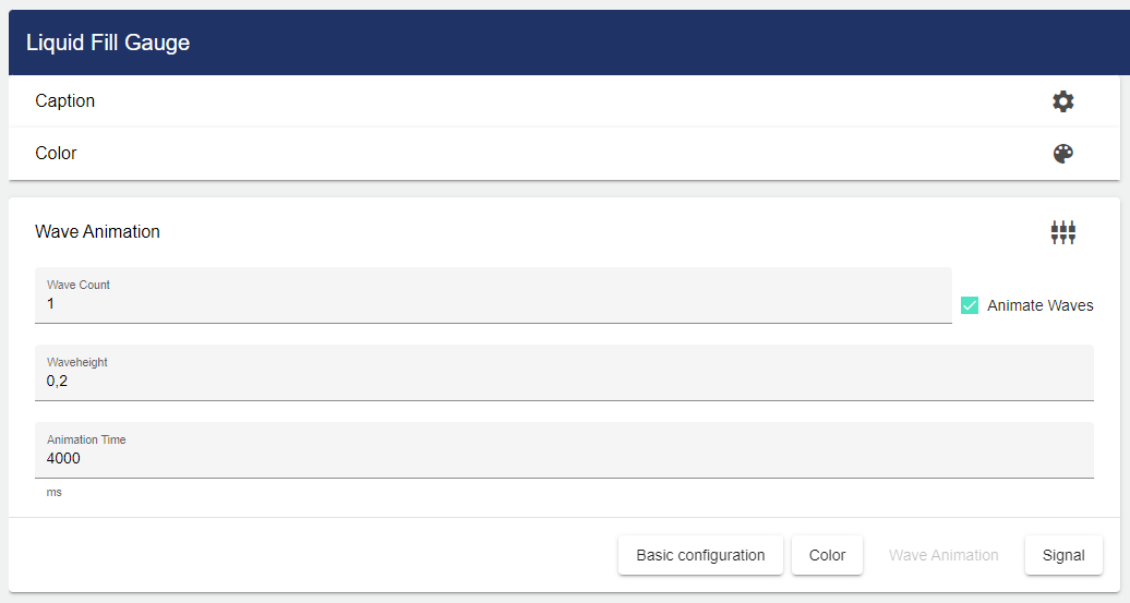 The widget displays the data of the selected analog signal as a wave. Depending on the value and the set limits, the filling level of the circle changes. When configuring the Level Measuring Instrument, there are many options and a preview to visualize the changes in real time. The slider also allows you to manually change the height of the measuring instrument in the preview.