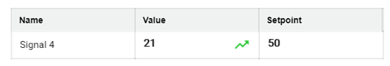 The Setpoint Table is used to compare an analog or digital input "value" ("name" and actual value of the signal) with an analog or digital output "setpoint". The name of the setpoint signal is not listed here. By clicking the corresponding setpoint, it can be set in the Dashboard. The Setpoint Table can be divided into several groups.