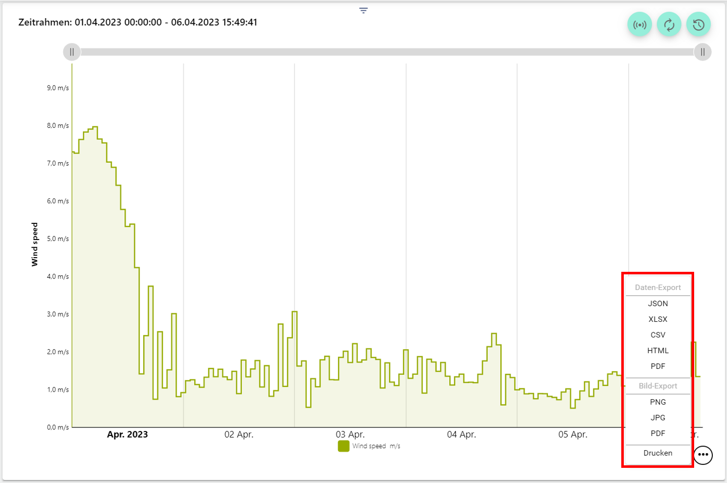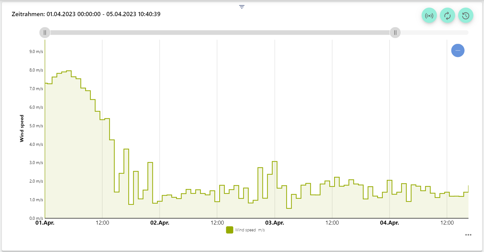 12.) The Central time control has been reworked and optimized. Now a channel can be selected with the familiar "Time Management" to control all desired Widgets: Analysis to control. In the example below, the time range of all widgets was set with one click. Thus, the time range from 03.04. to 05.04 can be evaluated easily and quickly.