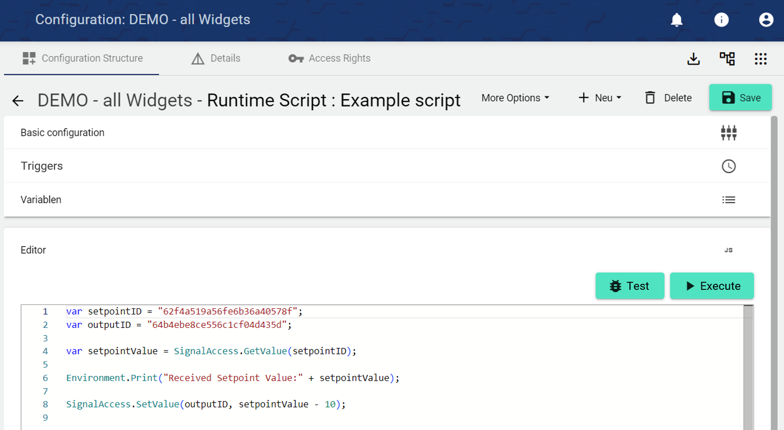 2.) As of this release, the JUMO smartWARE SCADA can execute program code trigger-based. It can now solve more complex automation tasks. For this purpose, the Runtime Script has been added to the configuration of each tenant. The scripting function can be used, for example, to query signal values, set setpoints based on events, implement a batch start or stop, or transfer a camera image to the archive. A script can also be used to check whether a camera image has been stored in the archive in a certain period of time.