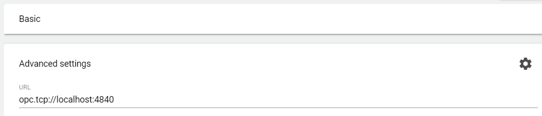 Via "Advanced settings" enter the URL address "opc.tcp://localhost:4840" and save it via the disk symbol. This URL address is used to address the OPC UA server. In the above case, the JUMO variTRON internal (localhost) OPC UA server of the Codesys is addressed. In principle, however, another, different connection to another OPC UA server in the network can also be established.