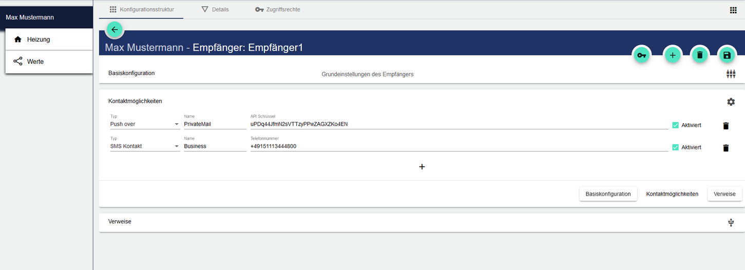 In the contact options, as already stated you can still select the name individually, in addition to the type, in order to facilitate assignment later. Depending on the type you have chosen, you will also need to enter an email address, an API key (required for the Push Over app) or a phone number. Finally, put a check mark after the contact options you want to use and save the configuration.