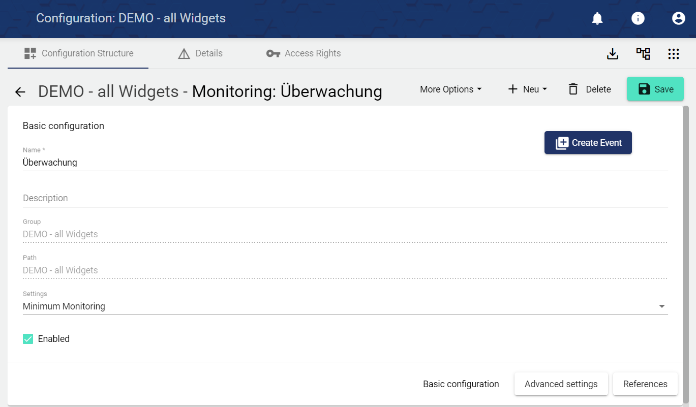 Assign the name of the monitoring operation in the Basic configuration. The Description field is optional. The "Group" field shows the Client in which the monitoring operation was created. The path is generated automatically by the system.