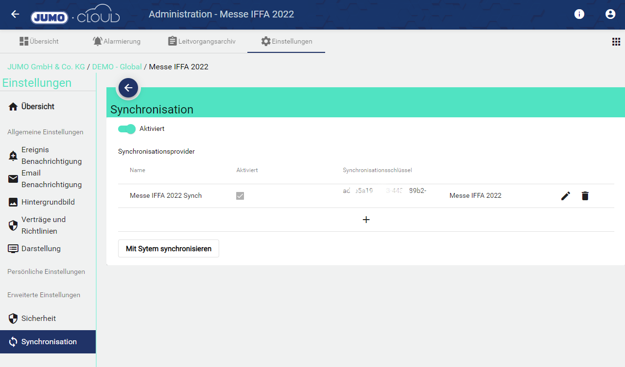 JUMO Cloud → Administration → Settings→ Synchronisation