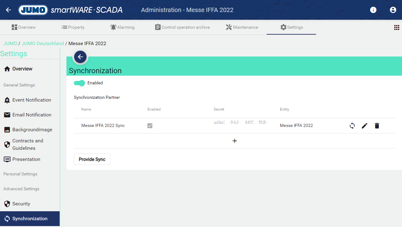 JUMO smartWARE SCADA → Administration → Settings→ Synchronisation