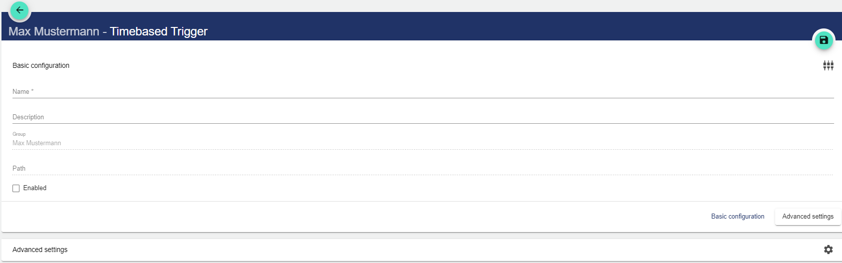 In the Basic Configuration of the Time-based Trigger, assign a suitable title. The Description field is optional. The "Group" field shows the Client in which this Trigger was created. The path is generated automatically by the system.