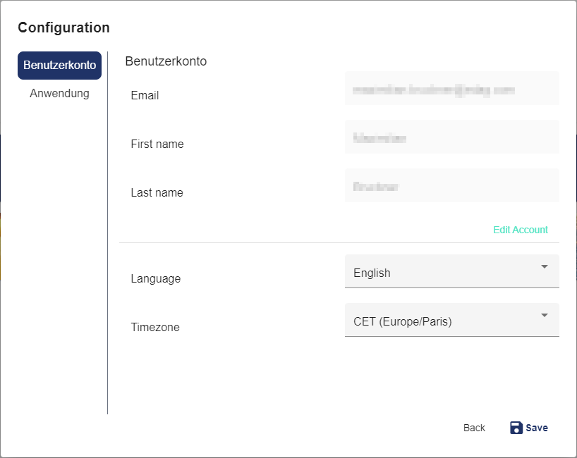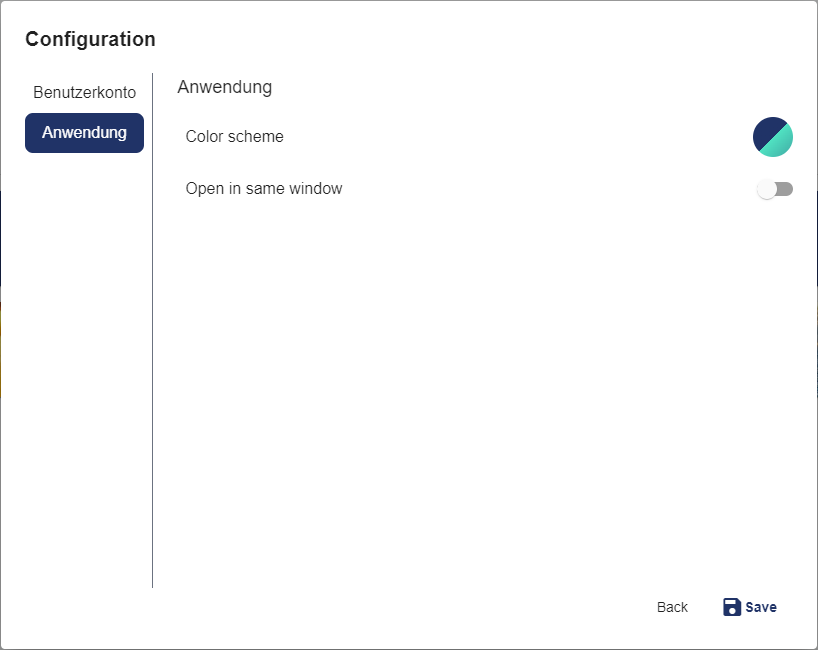 The time zone can be set under Settings. The language, colour scheme and account can also be edited here. You can also set whether the application opens in the same window or in a new window (browser tab) when you click on a client, for example.
