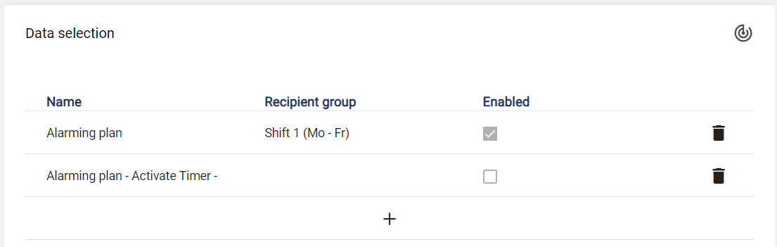 In the "Data selection" tab, the desired alarming plans can be selected and integrated via the Entity-Select.