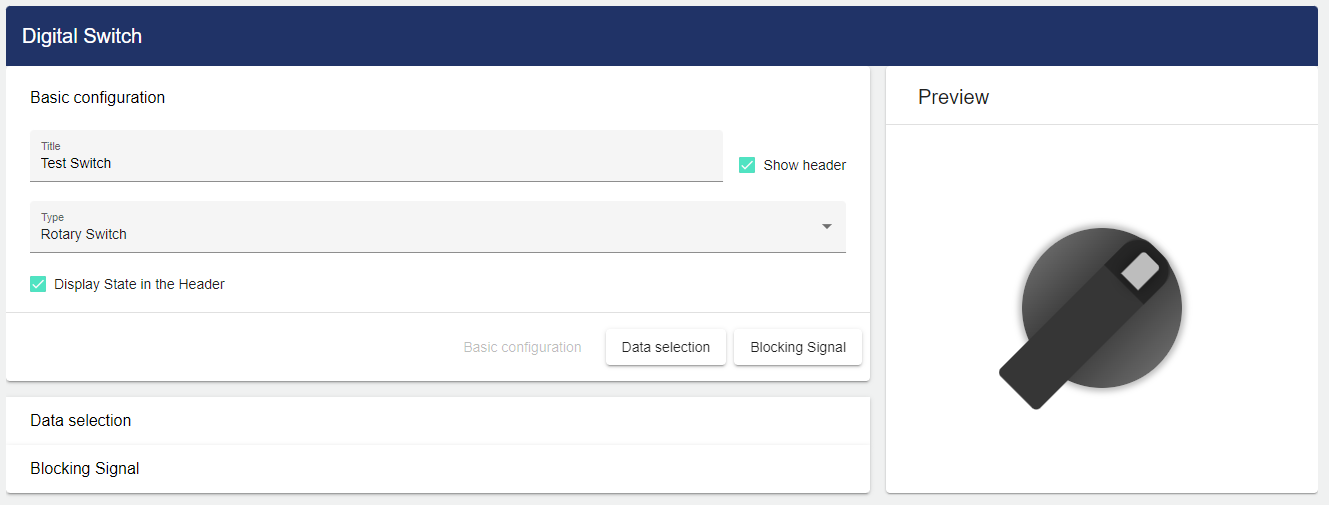 In the Basic Configuration of the Switch, assign a suitable title. The header can be displayed by selecting the check box. Now you have to select the type of switch, you can choose between "Switch" and "Rotary Switch".