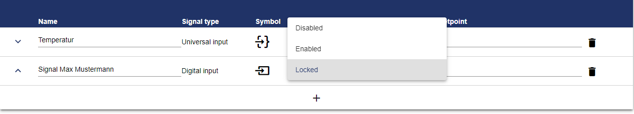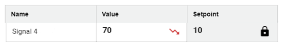 The Setpoint Table is used to compare an analog or digital input "value" ("name" and actual value of the signal) with an analog or digital output "setpoint". The name of the setpoint signal is not listed here. By clicking the corresponding setpoint, it can be set in the Dashboard. The Setpoint Table can be divided into several groups.