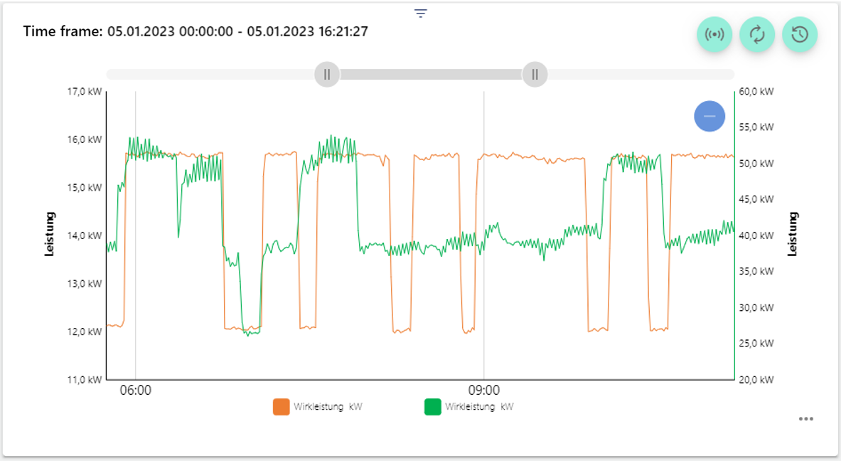 The Time Variation Chart presents a historical view of selected analog or digital data records. Optionally, a livemode can also be activated. Likewise, two time ranges can be compared with each other.