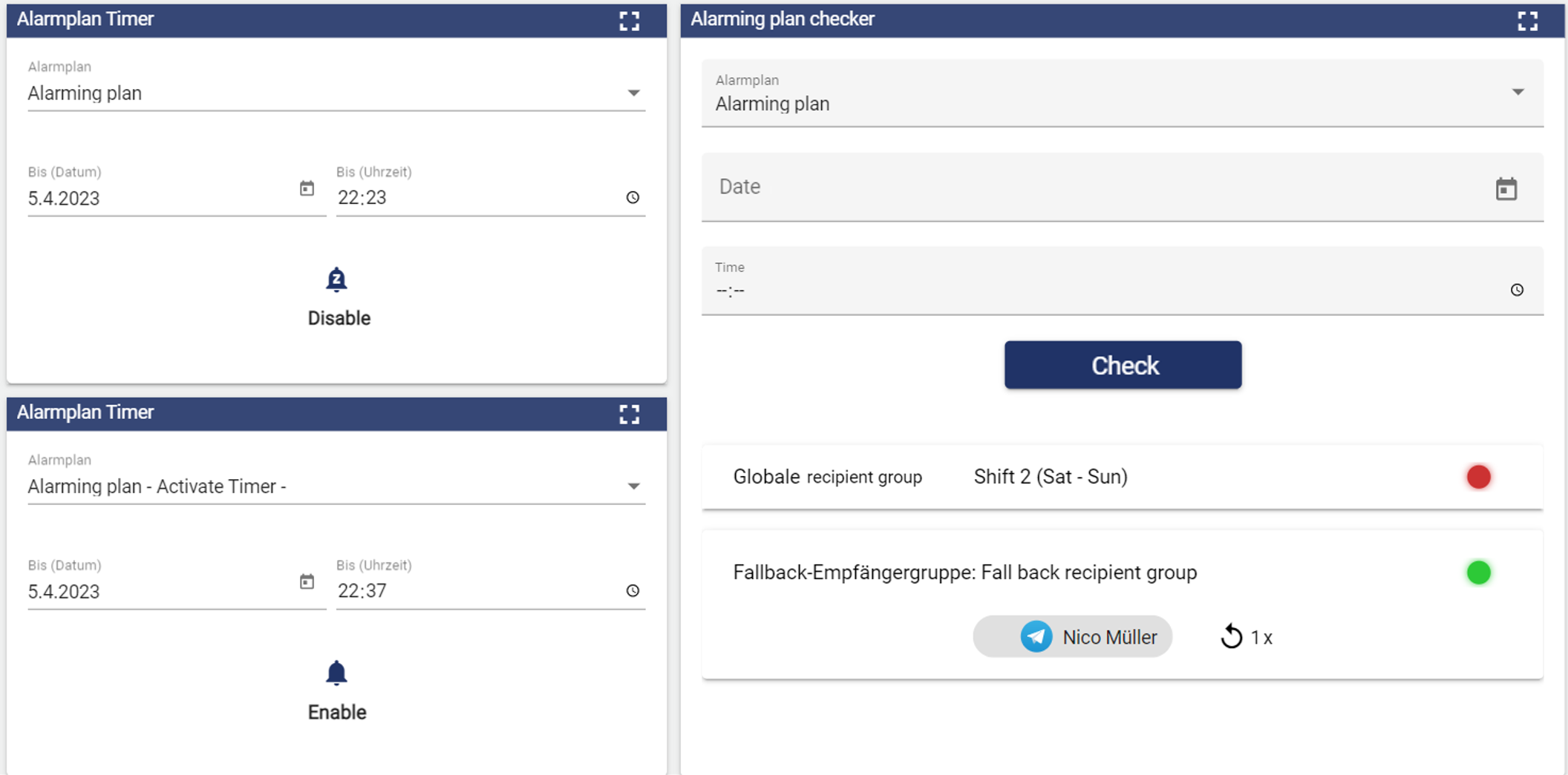 3.b) In addition to the widgets already mentioned in 3.a), there are corresponding additions in the configuration of the Alarming Plan. From now on it can be recognized if all settings, e.g. in the linked recipient group, have been made correctly. As in the widget, the alarming plan can be checked by date during configuration. If the alarm schedule was deactivated or activated via "Widget: Alarming plan timer", this can be viewed in the "Historical timer" tab.