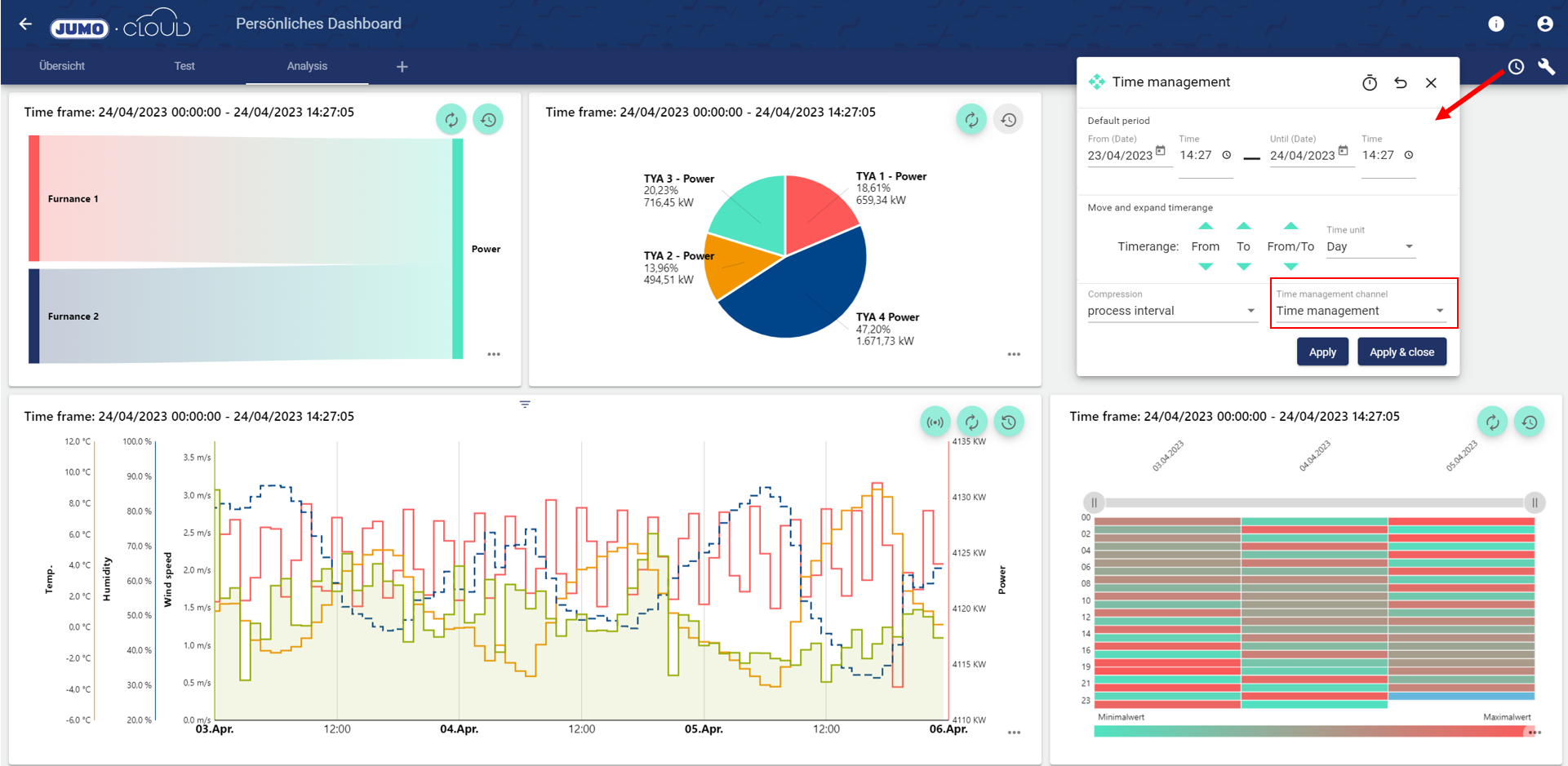12.) The Central time control has been reworked and optimized. Now a channel can be selected with the familiar "Time Management" to control all desired Widgets: Analysis to control. In the example below, the time range of all widgets was set with one click. Thus, the time range from 03.04. to 05.04 can be evaluated easily and quickly.