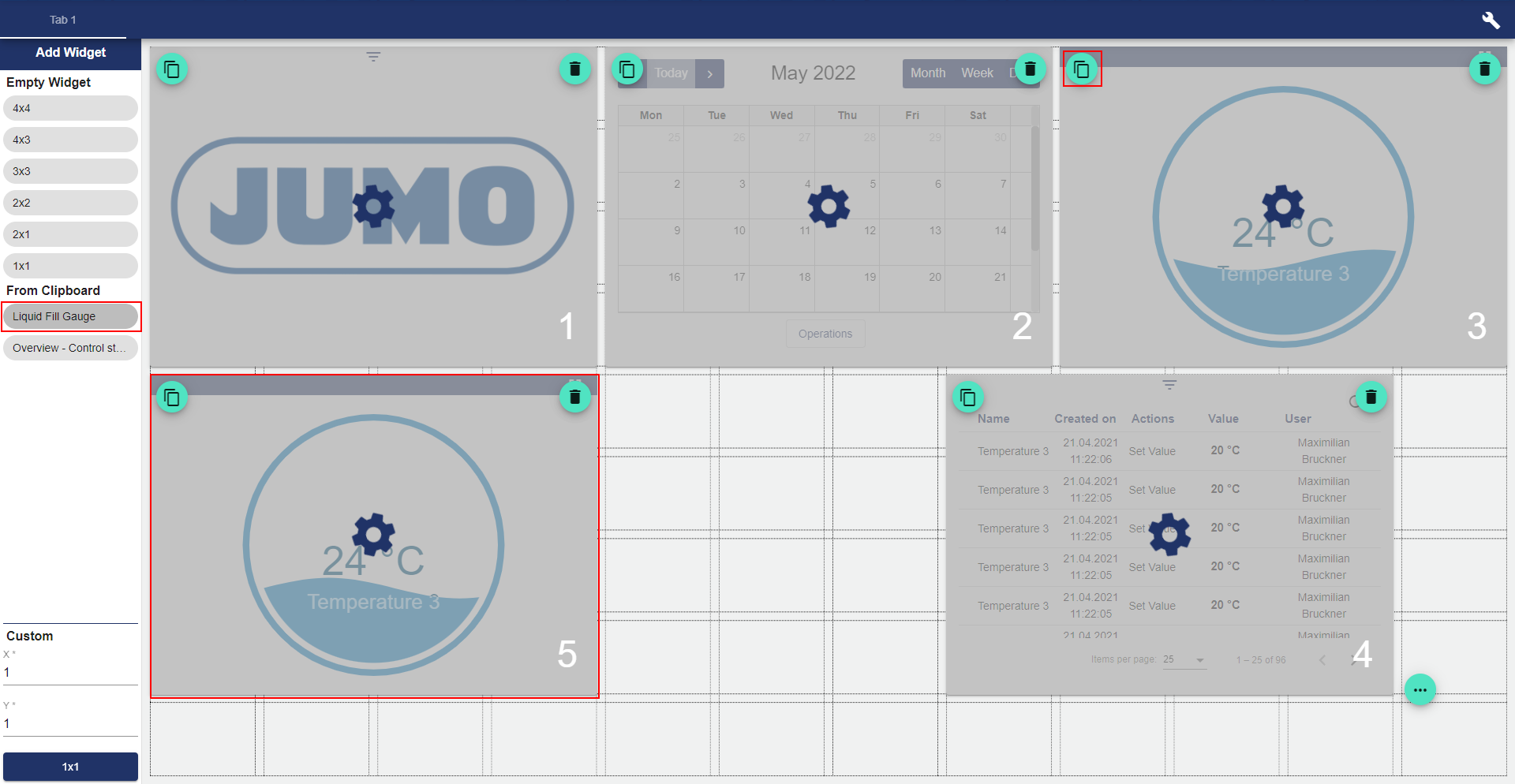 In Edit mode, existing widgets can be added, modified or copied. All signals and settings are automatically copied to the new widget.