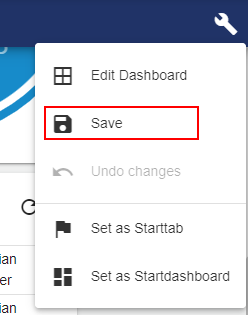 Any changes made to the visualization of the Dashboard or to the arrangement of the widgets must be saved for the changes to take effect. For this purpose, click on the three vertical points above one another and select the menu item: "Save".