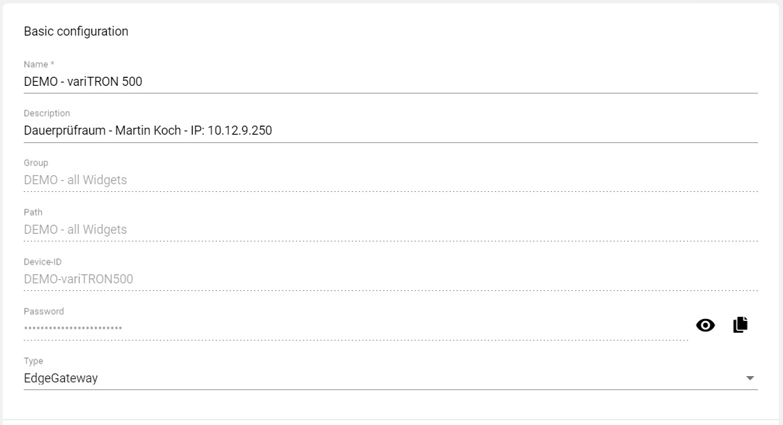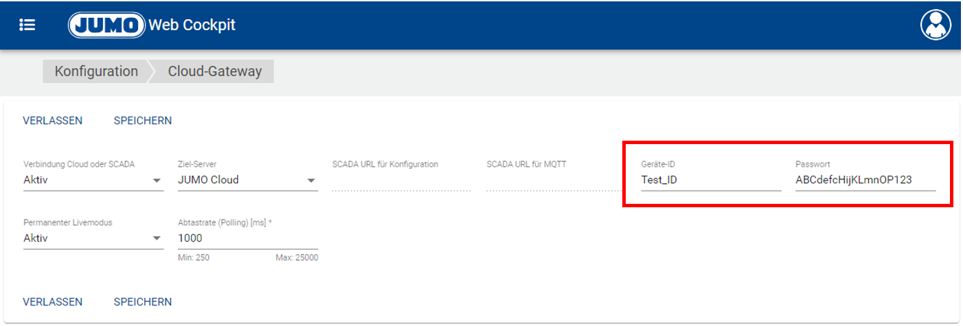 Under Configuration and Cloud Gateway in the "JUMO Web Cockpit" of the variTRON device, enter the following things: