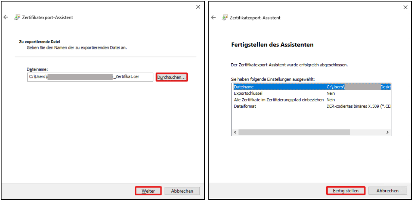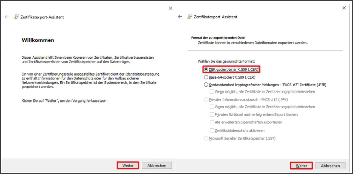 Click on "Next", now select "DER-coded binary X.509 (.CER)" as the data format and confirm this with "Next"