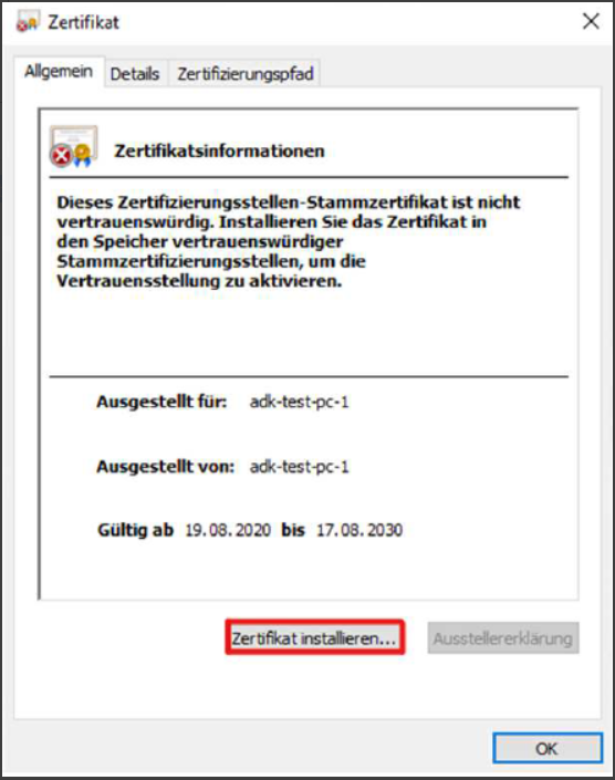 Now go to the location you have selected and open the certificate by clicking on it. Now select "Install certificate...".