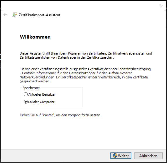 Select the Local computer as the storage location, or Current user if you do not have administrator rights on your PC. (Local computer only offers the advantage that the certificate is also available for other users, this is not a must!)