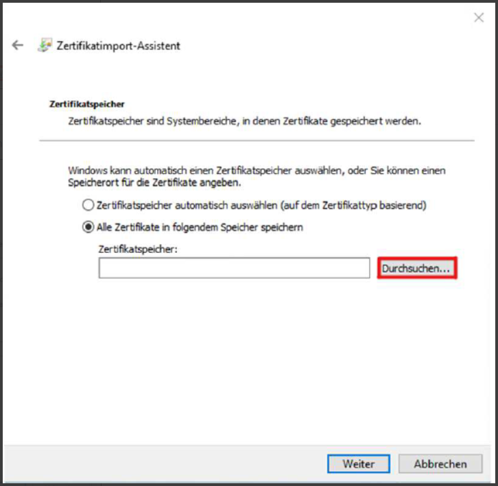Select "Save all certificates in the following memory" and click on "Browse...".