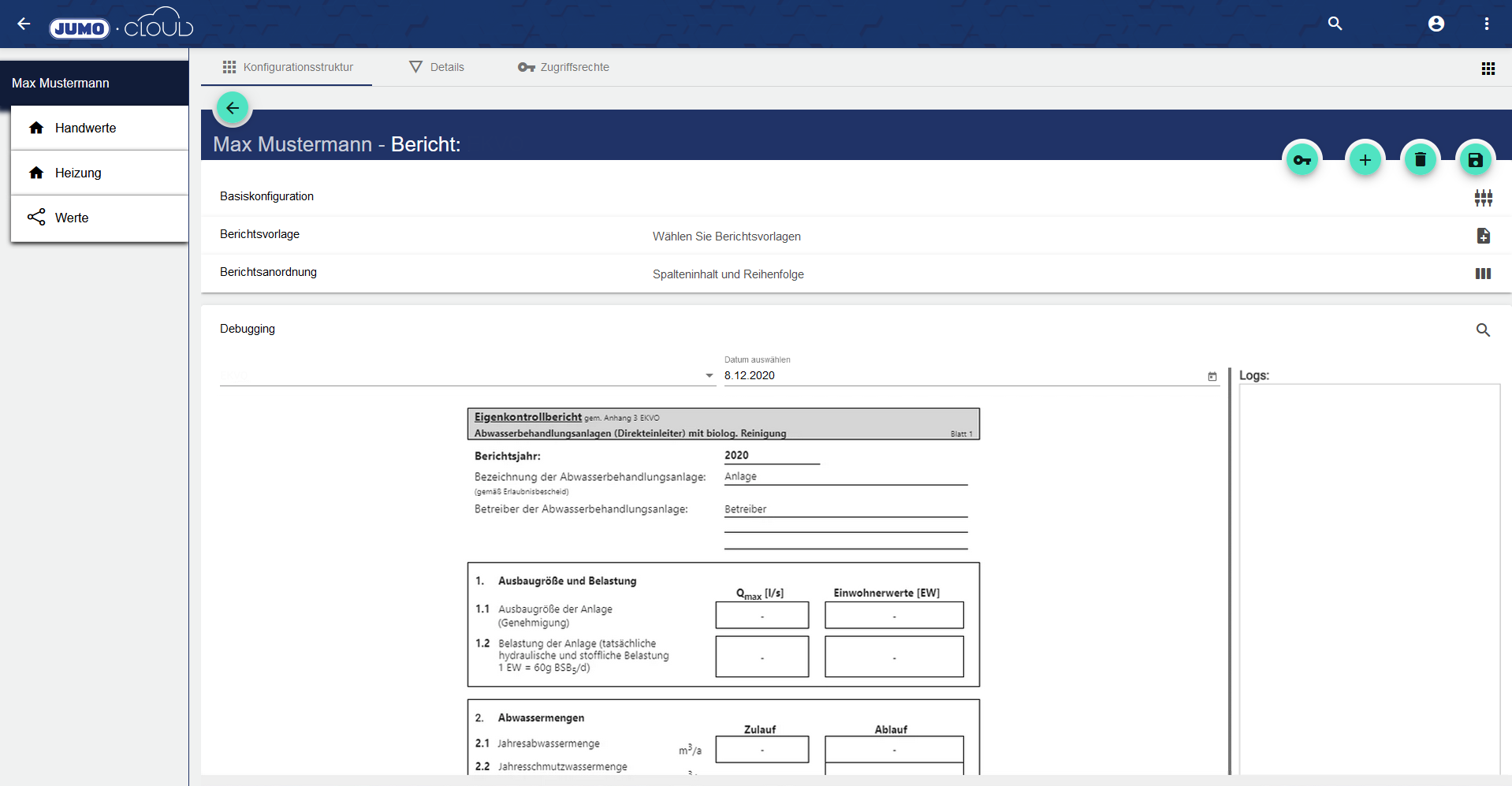 This allows you to select the desired report template from the previously defined templates and display it in the debug preview below. Error messages are also displayed in the logs. To select the data for a specific day, month or year, you can select via the date.