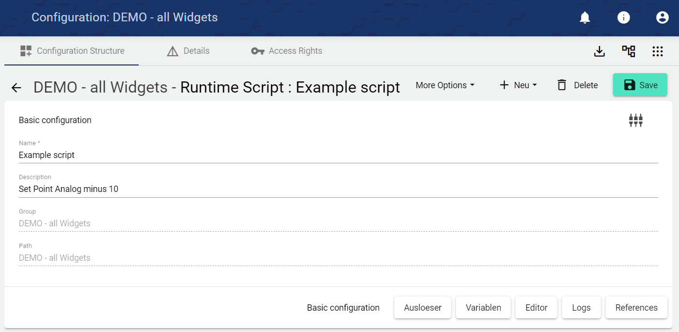 The Runtime Script is used to create program code and run it trigger-based. This can be used, for example, to query signal values, set target values based on events, implement a batch start or stop, or transfer a camera image to the archive. It is also possible to use a script to check whether a camera image is available in the archive within a certain period of time.